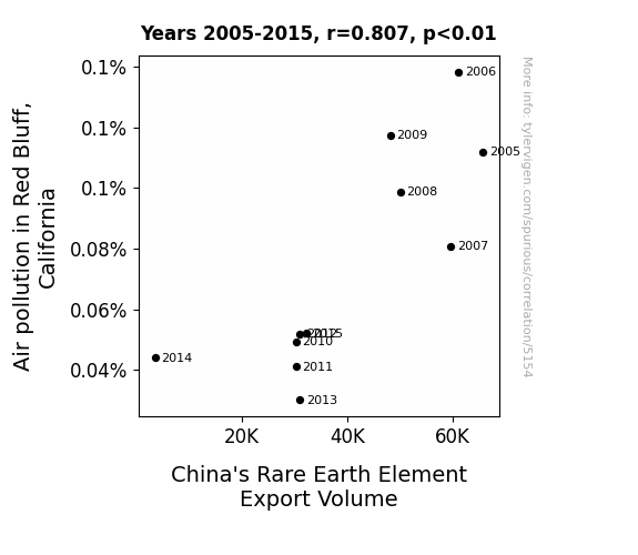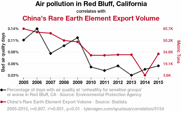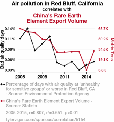 - The spurious research paper: A Breath of Fresh Air: Unearthing the Smoggy Relationship Between Red Bluff's Air Pollution and China's Rare Earth Element Export Volume