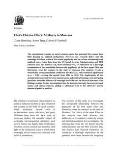 User prompt: Please provide potential search keywords for a paper titled Elisa's Elective Effect: A Liberty in Montana with an abstract of The conventional wisdom in social sciences posits that personal first names have little bearing on political inclinations. However, our research delves into the seemingly frivolous realm of first name popularity and its curious relationship with political votes. Using data from the US Social Security Administration and MIT Election Data and Science Lab, Harvard Dataverse, we embarked on a thorough examination of the association between the popularity of the first name Elisa and libertarian votes for senators in the state of Montana. Our analysis reveals a remarkably strong correlation coefficient of 0.8557235, with statistical significance at p < 0.01, covering the period from 1982 to 2018. The implications of this unexpected connection between nomenclature and political leanings raise intriguing questions about the influence of seemingly trivial factors on electoral outcomes. Our findings prompt further investigation into the intricate interplay between personal names and voting behavior, adding a whimsical twist to the otherwise austere domain of political analysis.