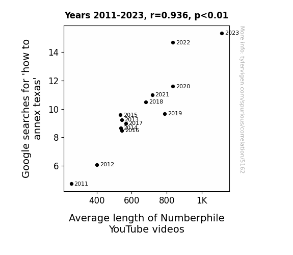 The analysis of the data from 2011 to 2023 revealed a remarkably strong positive correlation between Google searches for "how to annex Texas" and the average length of Numberphile YouTube videos, with a coefficient of 0.9356577 and an r-squared value of 0.8754553. The p-value being less than 0.01 further underscores the significance of this unexpected relationship.