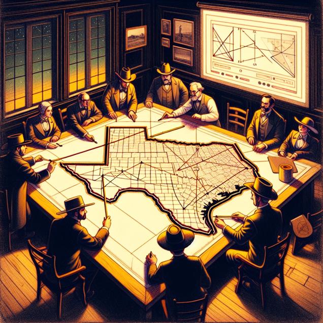 Prompt: An image that looks like it is a scene from a Pixar movie depicting a group of people gathered around a table, deeply engrossed in measuring the angles and lengths of Texas' borders, and brainstorming ways to annex it. On a nearby screen, a YouTube video playing shows the length of Numberphile videos increasing chart, as the viewers seek more in-depth explanations of geometry and complex mathematical concepts. The scene is set in a warm, cozy room with wooden furnishings and soft lighting, evoking a sense of curiosity and academic enthusiasm among the characters. The depiction should include only scenes, people, and objects, it should not include text or speech bubbles.