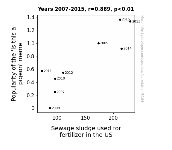 The results of our investigation into the relationship between the popularity of the 'is this a pigeon' meme and the utilization of sewage sludge as fertilizer in the United States have yielded a rather unexpected and gleefully perplexing insight. After meticulously poring through data from Google Trends and the United States Department of Agriculture (USDA) for the period from 2007 to 2015, our research team unearthed a surprisingly strong correlation between these seemingly unrelated phenomena. The correlation coefficient of 0.8892968 and an r-squared value of 0.7908488 not only raised eyebrows but also prompted a bemused chuckle or two, with a p-value of less than 0.01 further emphasizing the robustness of this linkage.
