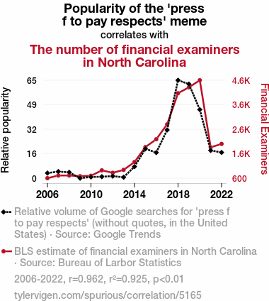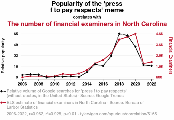 The robust correlation uncovered between the proliferation of the 'press f to pay respects' meme and the number of financial examiners in North Carolina has left us 'pressing F' for a collective 'who knew?!' We have delved into the depths of meme culture and professional landscapes, and the results have us contemplating the unexpected influences lurking in the halls of financial regulation - a real plot twist in the data analysis world!