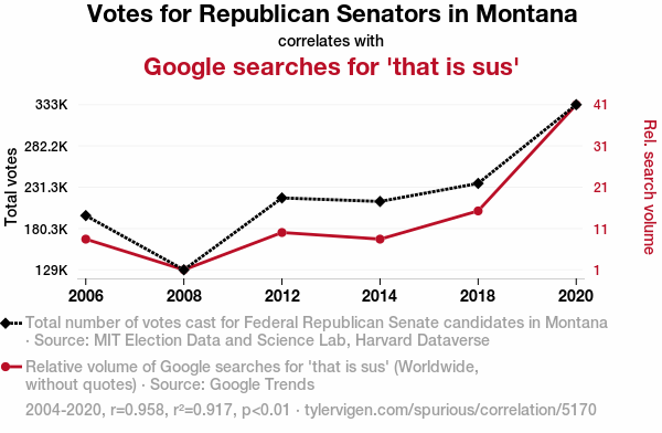 - The spurious research paper: The GOP is Sus: A Correlational Study of Republican Votes for Senators in Montana and Google Searches for 'That Is Sus'