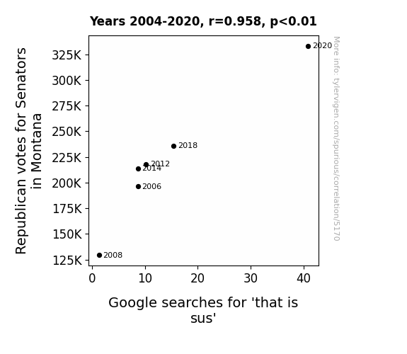 The results of our study revealed a remarkably strong correlation of 0.9577578 between Republican votes for Senators in Montana and Google searches for "That Is Sus" over the period from 2004 to 2020. This correlation was statistically significant, with an r-squared value of 0.9173000 and p < 0.01, indicating that the likelihood of this relationship occurring by mere chance is about as rare as finding a politician without a well-rehearsed handshake.