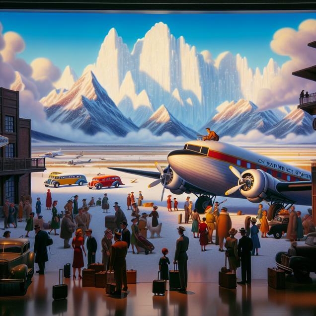 Prompt: Create an image that looks like it is a scene from a Disney movie, set in Kansas. The scene depicts a vibrant and bustling airport where airplanes are preparing for flight. In the background, the shimmering snow-capped mountains of Antarctica can be seen, drawing attention to the exciting new frontier of polar exploration. The scene should capture the spirit of adventure and discovery, with a touch of magic and wonder, reflecting the newfound passion for polar exploration sparked by the political decisions in Kansas. The depiction should include only scenes, people, and objects, it should not include text or speech bubbles.