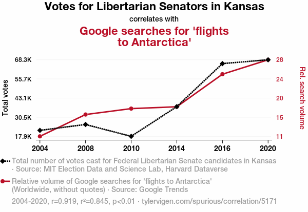 - The spurious research paper: Kansas Senators' Libertine Feats and Antarctic Retreats: Exploring the Correlation between Libertarian Votes and Searches for Flights to Antarctica