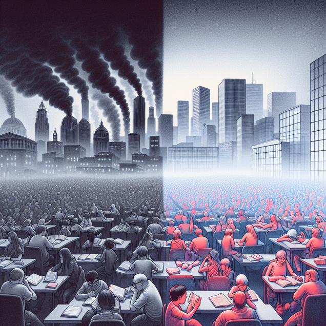 Prompt: Generate an image capturing the contrasting scenes of Stockton, California, enveloped in thick smog and the UK public library with a crowd of eager readers. The juxtaposition of the two settings should convey the stark contrast between pollution and the celebration of knowledge. The atmosphere should be depicted with an emphasis on the smog engulfing Stockton, while the UK scene depicts the energy and excitement of the crowd outside the public library. The depiction should include only scenes, people, and objects, it should not include text or speech bubbles.