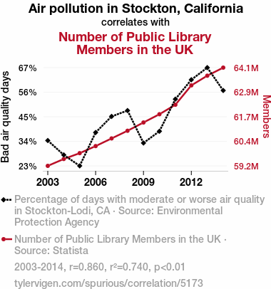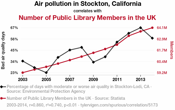 Air pollution, Stockton California, public library members, UK, environmental protection agency, Statista, correlation coefficient, particulate matter, atmospheric pollutants, literature preferences, human behaviors, library memberships, peculiar correlation, influence of air pollution, human preferences, atmospheric phenomena