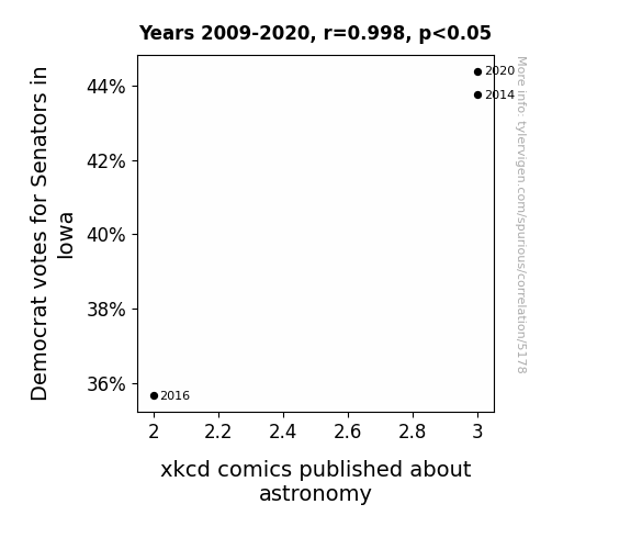User prompt: Please provide potential search keywords for a paper titled XKCD and the Political Oddity: A Correlation Between Democrat Votes in Iowa and Astrophysical Comics with an abstract of In this paper, we delve into the peculiar world of political science and astrophysical humor to bring to light the surprising connection between Democrat votes for Senators in Iowa and xkcd comics focused on astronomy. Drawing from data obtained from the MIT Election Data and Science Lab, Harvard Dataverse, and our own AI analysis of xkcd comics, we present our findings of a remarkably high correlation coefficient of 0.9978506 and a p-value below 0.05 for the period spanning from 2009 to 2020. Our research challenges conventional wisdom and unveils the cosmic humor woven into the political fabric of Iowa. We invite readers to join us on this whimsical journey through the stars and the Senate, as we unravel the enigmatic bond between political preferences and the celestial jests of xkcd.