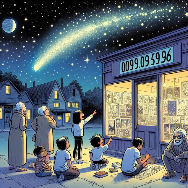Prompt: Generate an image of a quaint bookstore in a small town in Iowa, where a prominent sign declares "Iowa Democrat Votes" with a steadily increasing count. Outside, under the starry night sky, a group of people gather, pointing excitedly at the sky. Above them, a glowing cosmic energy radiates in harmony with the increasing votes, reflecting the astrophysical energy swirling around. Inside the bookstore, the creator of xkcd is seen scribbling away with a wide grin, crafting astronomy-themed comics that seem to be inspired by the celestial energy pulsating through the state. The depiction should include only scenes, people, and objects, it should not include text or speech bubbles.