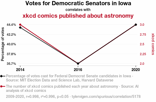 It's well known that as Democrat votes for Senators in Iowa increase, so does the cosmic energy in the state. This in turn resonates with the creators of xkcd, leading to a surge in inspiration for astronomy-related comics. It's a celestial political phenomenon that's truly out of this world!