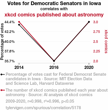 - The spurious research paper: XKCD and the Political Oddity: A Correlation Between Democrat Votes in Iowa and Astrophysical Comics
