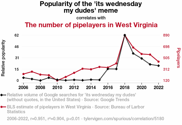 - The spurious research paper: Mining for Laughs: Unearthing the Connection Between 'Its Wednesday My Dudes' and Pipelayers in West Virginia