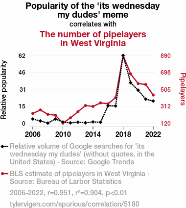This means 90.4% of the change in the one variable (i.e., The number of pipelayers in West Virginia) is predictable based on the change in the other (i.e., Popularity of the 'its wednesday my dudes' meme) over the 17 years from 2006 through 2022.