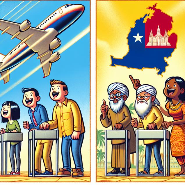 User prompt: Please describe a visual scene that prominently depicts both Libertarian votes for Senators in Michigan and Jet fuel used in Cambodia, in the following situation: As Libertarian votes soared in Michigan, their platform of limited government intervention took off like a jet, inspiring Cambodian fuel suppliers to also go full throttle. It seems the fervor for freedom in one place can really fuel change in another!. Keep the description simple.