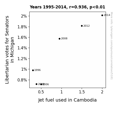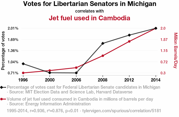 A linear line chart with years as the X-axis and two variables on the Y-axis. The first variable is Libertarian votes for Senators in Michigan and the second variable is Jet fuel used in Cambodia.  The chart goes from 1995 to 2014, and the two variables track closely in value over that time. Small Image