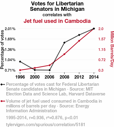 Libertarian votes, Michigan Senators, jet fuel consumption, Cambodia, MIT Election Data and Science Lab, Harvard Dataverse, Energy Information Administration, statistical analysis, correlation coefficient, interdisciplinary exploration