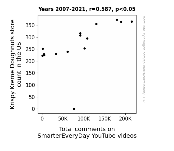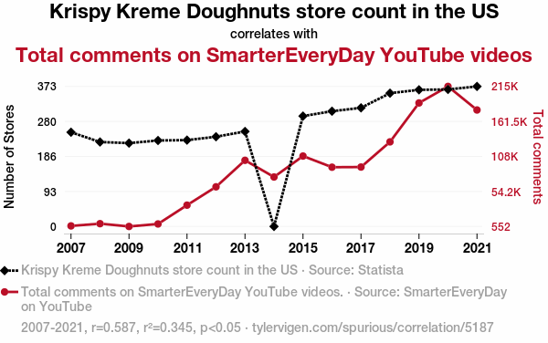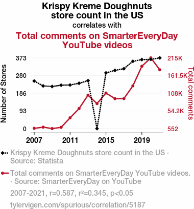 - The spurious research paper: Doughnuts and Comments: A Statistical Correlation Examining the Relationship between Krispy Kreme Store Count in the US and Total Comments on SmarterEveryDay YouTube Videos