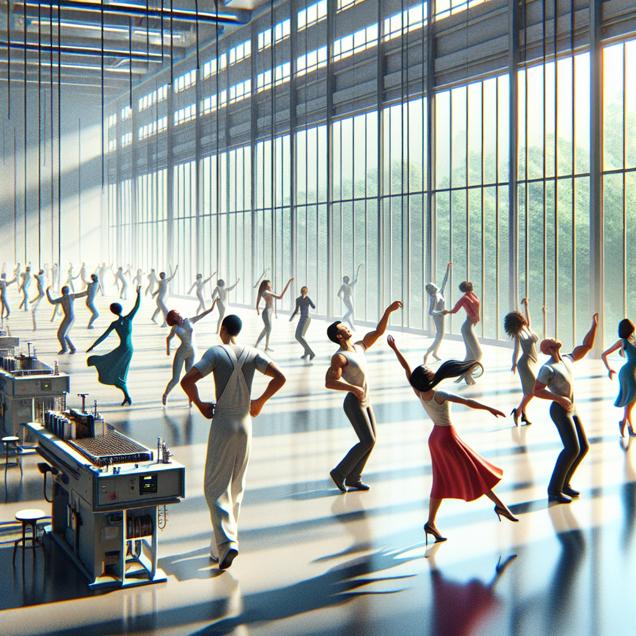 Prompt: Generate an image of a futuristic dance studio nestled amidst a green landscape in Lancaster, Pennsylvania. Show a bright, airy space with large windows and sleek, modern architecture. Inside, depict a group of former heat treating equipment setters, operators, and tenders, metal and plastic, joyfully twirling and swaying to the vibrant rhythm of salsa music. Their expressions reflect the joy of pursuing their new passion, and their movements are captured in a futuristic, artistic style. The scene should depict the surprising transition of the workforce, inspired by the uplifting change in their surroundings, with subtle futuristic elements integrated into the image. The depiction should include only scenes, people, and objects, it should not include text or speech bubbles.