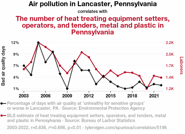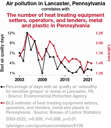 This means 69.8% of the change in the one variable (i.e., The number of heat treating equipment setters, operators, and tenders, metal and plastic in Pennsylvania) is predictable based on the change in the other (i.e., Air pollution in Lancaster, Pennsylvania) over the 20 years from 2003 through 2022.