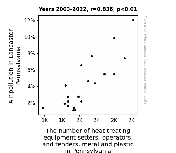 The scorching investigation into the fiery relationship between air pollution in Lancaster, Pennsylvania, and the number of heat treating equipment setters, operators, and tenders, metal and plastic in the state of Pennsylvania yielded some hot-off-the-press results. Our data analysis set the statistical landscape ablaze, revealing a striking correlation coefficient of 0.8355227, an r-squared of 0.6980982, and a p-value of less than 0.01 for the period spanning 2003 to 2022.