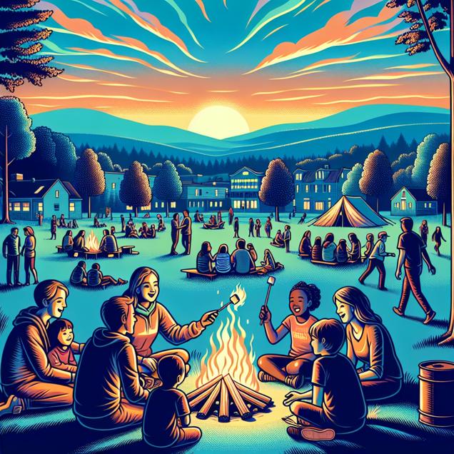Prompt: Create an image showing a serene park scene in Burlington, Vermont. Families and friends gather around crackling campfires, with children eagerly roasting marshmallows and making s'mores. The setting sun casts a warm glow over the clear blue sky, showcasing the vibrant colors of the park. The air quality is visibly improved, reflecting the clean and fresh atmosphere. As more people join in the outdoor fun, there's a sense of community and enjoyment in the picturesque surroundings. The depiction should include only scenes, people, and objects, it should not include text or speech bubbles.