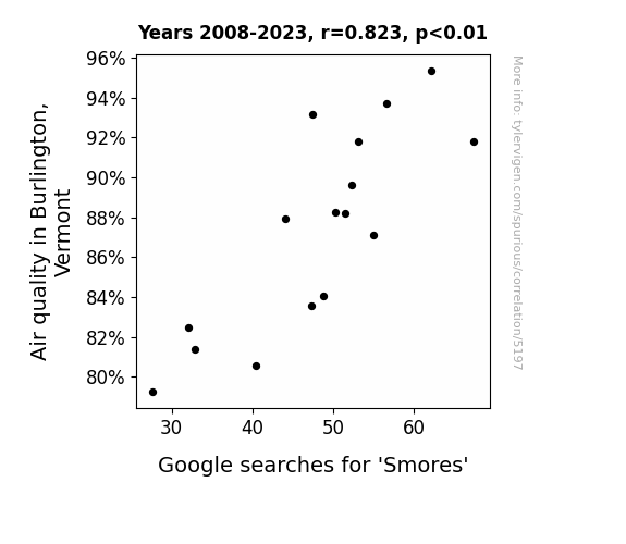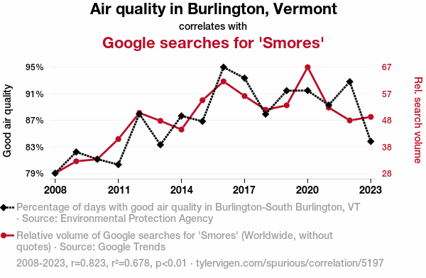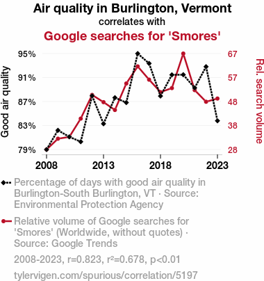 - The spurious research paper: Choking on Smog, Craving Smores: Correlating Air Quality in Burlington, Vermont with Google Searches for Sweet Treats