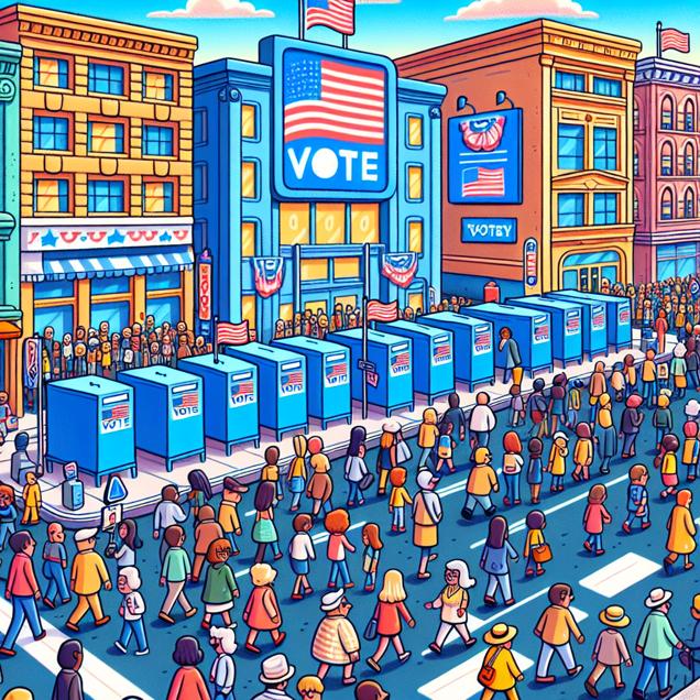 Prompt: [ Cute cartoon ] In the heart of downtown Connecticut, a lively street thrums with activity. People of all ages and backgrounds bustle along the sidewalk, creating a vibrant tapestry of movement. A large, cheerful-looking billboard adorned with colorful letters prominently displays the name "Emani" in bold, capturing the attention of passersby with its inviting allure. This captivating sign seems to exude a palpable aura of influence over the bustling street, sparking a sense of curiosity and excitement among onlookers. Amidst the bustling scene, a row of vibrant blue voting booths stands proudly, each adorned with fluttering flags. A steady stream of eager voters flows toward the booths, determined and purposeful as they enter to cast their ballots for the Democratic Presidential candidate. The air crackles with a sense of anticipation and unity as the growing popularity of the "Emani" name aligns with the rising support for the Democratic candidate, creating an electrifying atmosphere filled with the Emani effect—a seamless fusion of name recognition and political momentum. The scene is alive with the energy of democracy in action, as the anticipation of a Emani-cipated blue wave in the state builds. The playful cartoon-style illustration captures the dynamic essence of the bustling street, entwining the spirit of community, election excitement, and the magnetic allure of the "Emani" name in a visually captivating way. The depiction should include only scenes, people, and objects, it should not include text or speech bubbles.