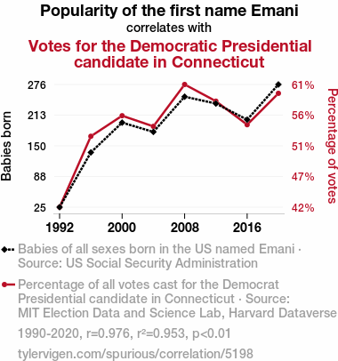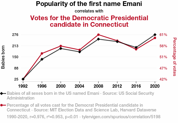 This means 95.3% of the change in the one variable (i.e., Votes for the Democratic Presidential candidate in Connecticut) is predictable based on the change in the other (i.e., Popularity of the first name Emani) over the 8 years from 1990 through 2020.