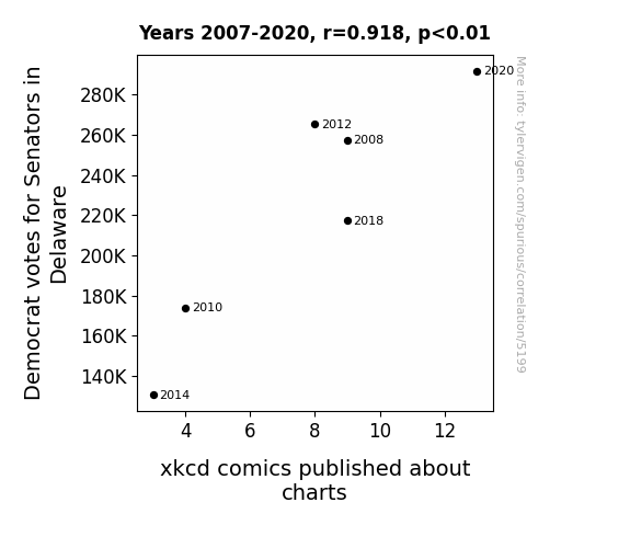 The analysis of the data revealed an eyebrow-raising correlation coefficient of 0.9184889 between the votes for Democrat Senators in Delaware and the publication of xkcd comics featuring charts from 2007 to 2020. This correlation is as strong as the aroma of fresh coffee on a Monday morning and suggests a compelling link between political inclinations and the portrayal of information in xkcd's signature quirky and insightful style.