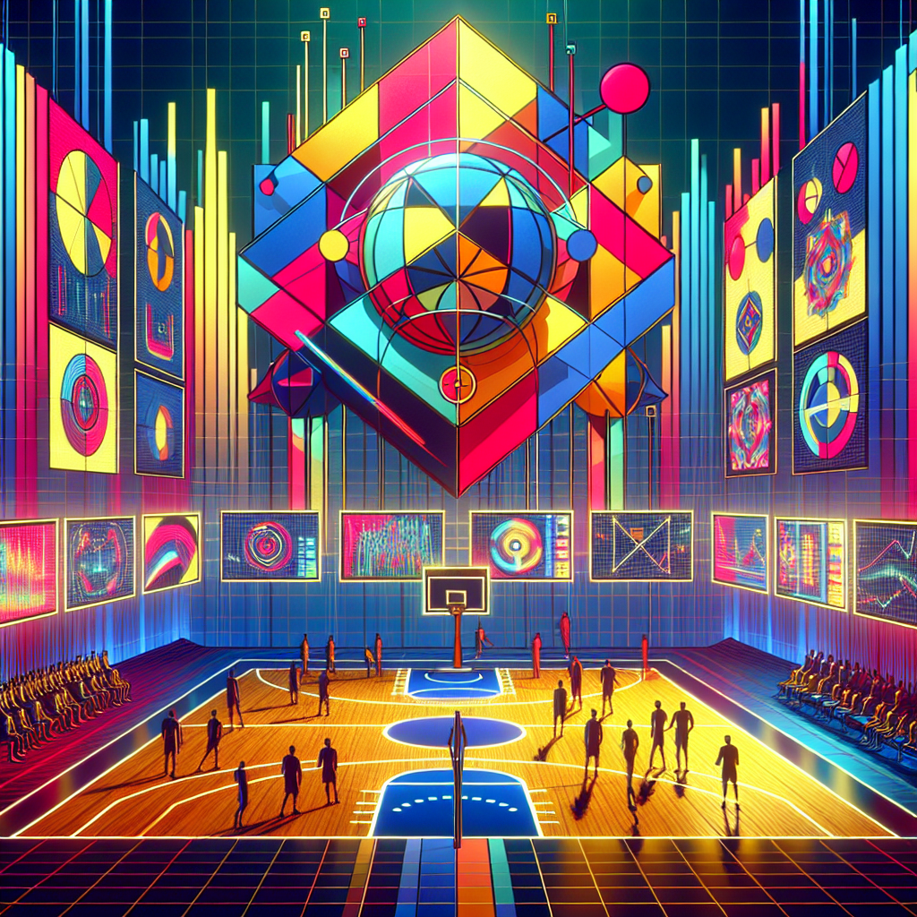 User prompt: Please respond with an image generation prompt that would be likely to create an interesting visual using DALLE-3, using the following style: [ inspired by bauhaus ] and depicting this scene: Imagine a vibrant basketball court where the name "Kareem" is spelled out in colorful, bold letters at center court. Surrounding the court, video screens display the minutephysics logo in the background, with each video showing an average likes counter rapidly increasing. It's as though the very mention of Kareem has energized the atmosphere, causing a wave of positivity that directly reflects in the likes multiplying on the minutephysics videos displayed around the court. Keep the visual depiction simple. Do not include any words or speech bubbles.