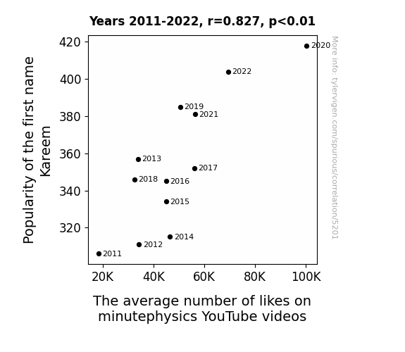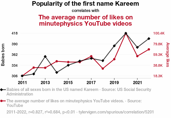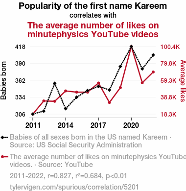 Kareem, YouTube likes, name popularity, correlation, minutephysics, US Social Security Administration, statistical analysis, digital appreciation, nomenclature, data analysis, correlation coefficient, p-value, YouTube videos, social trends, naming trends.