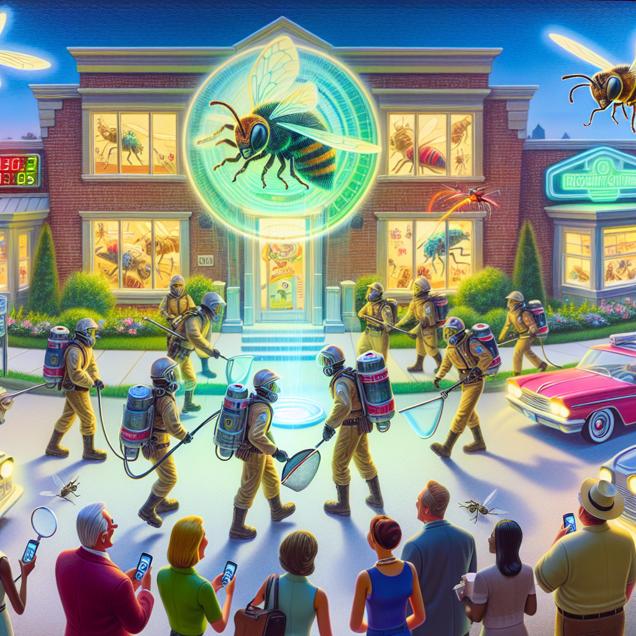 ChatGPT: An image that looks like it is a scene from a Pixar movie: Show a vibrant and colorful animated scene in a bustling Delaware town. The pest control workers, wearing uniquely designed uniforms and carrying exaggerated-sized nets and spray gear, are eagerly lined up outside a whimsical building that serves as a training center. To the side, a group of people gathers around a glowing smartphone, displaying a captivating bug video with awe and fascination. In the background, a counter steadily increases, mirroring the growing number of individuals drawn into the captivating world of insects, adding a magical touch to the overall scene.