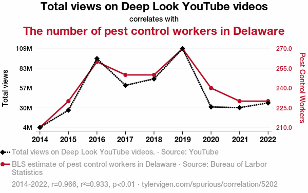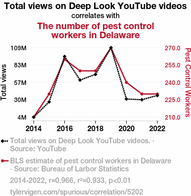 This means 93.3% of the change in the one variable (i.e., The number of pest control workers in Delaware) is predictable based on the change in the other (i.e., Total views on Deep Look YouTube videos) over the 9 years from 2014 through 2022.