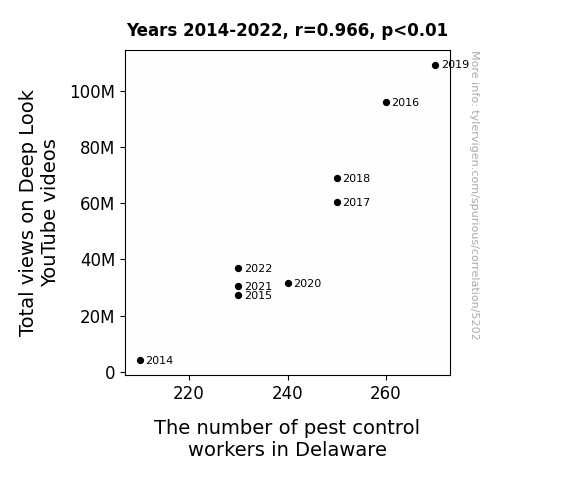 Our analysis of the connection between the total views on Deep Look YouTube videos and the number of pest control workers in Delaware over the period of 2014 to 2022 revealed a striking correlation coefficient of 0.9658862. This strong positive association indicates that as the views on Deep Look videos increased, the number of pest control workers in the state also showed a noteworthy upward trend. It's almost as if the insect enthusiasts on YouTube were inadvertently buzzing in more workers to manage real-life critters in Delaware!