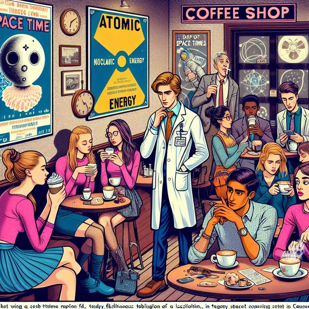 Prompt: [ Whimsical illustration ] In a trendy Connecticut coffee shop, a group of young, stylish PBS Space Time enthusiasts sit around a table, sipping lattes and engaging in enthusiastic conversation about the latest video titles. Meanwhile, in the background, a lone nuclear medicine technologist stands near a vintage atomic energy poster, adjusting his lab coat with a determined expression. The convergence of 'hip and with it' vibes faces a quantum disruption, and the spacetime itself seems to warp around the scene, reflecting the cosmic conundrum at hand. The depiction should include only scenes, people, and objects, it should not include text or speech bubbles.