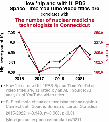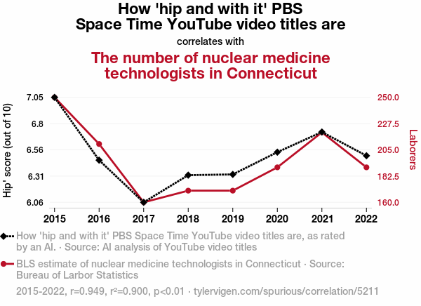 This means 90% of the change in the one variable (i.e., The number of nuclear medicine technologists in Connecticut) is predictable based on the change in the other (i.e., How 'hip and with it' PBS Space Time YouTube video titles are) over the 8 years from 2015 through 2022.