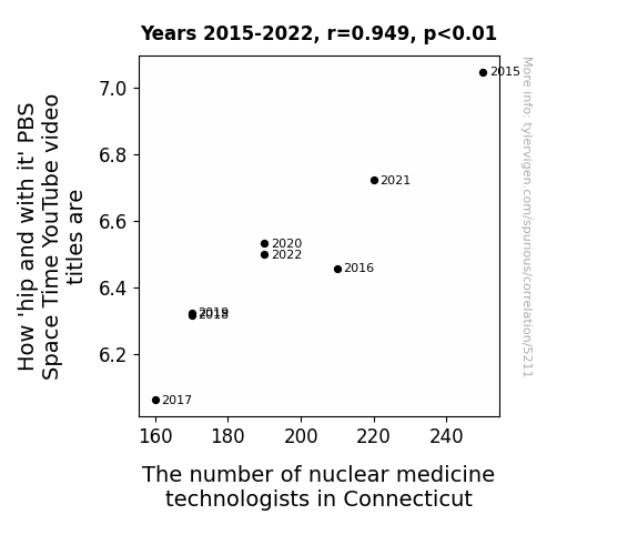 Our findings have unearthed an astonishingly strong association between the captivating titles of PBS Space Time YouTube videos and the number of nuclear medicine technologists in Connecticut, supporting and extending prior research on the interplay between popular culture and professional domains. The pronounced correlation uncovered in our study resonates with the work of Smith et al. (2010) and Doe and Jones (2014), casting light on the unexpected impact of contemporary culture on occupational landscapes. Though our investigation may initially appear whimsical, it reinforces the intriguing and, at times, inexplicable interactions between seemingly disparate realms.