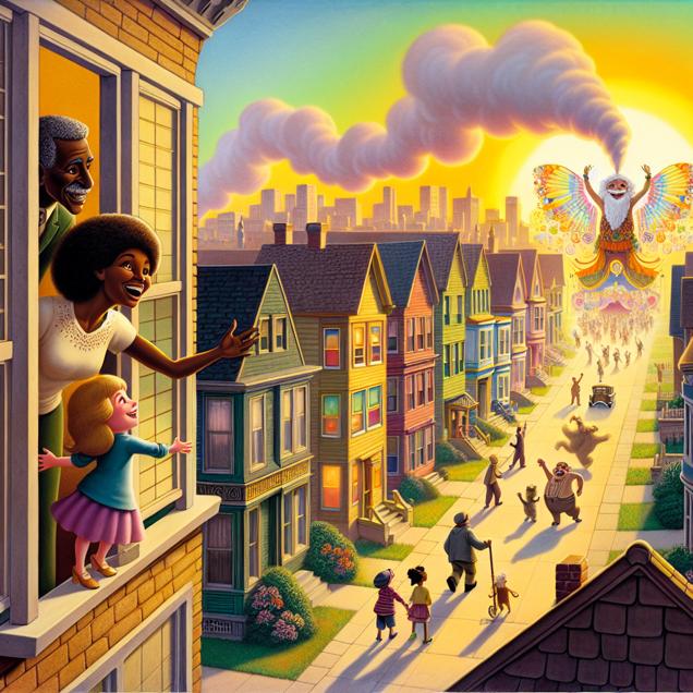 ChatGPT: [ An image that looks like it is a scene from A Disney Movie ] depicting this scene: In Sheboygan, Wisconsin, as the air pollution cleared, residents joyfully opened their windows to let in the fresh air. In the background, a catchy new song called "Sheboygan Style" played, quickly becoming the local anthem. The once popular Google searches for 'Gangnam Style' were replaced by the catchy beats of the new local hit. Enhanced Visual: The image features a charming neighborhood in Sheboygan, Wisconsin, with colorful houses lining the streets. The setting is bathed in warm sunlight as the air pollution clears. Residents are depicted opening their windows and leaning out with smiling faces, welcoming the fresh air. In the background, a whimsical musical procession of animals and townsfolk is seen, dancing to the upbeat "Sheboygan Style" song. The entire scene is enveloped in a touch of magic, showcasing the joy and vibrancy of the community.