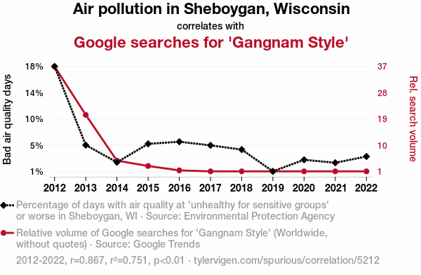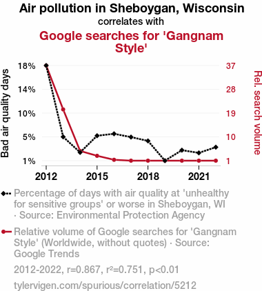 - The spurious research paper: Gangnam Smog: Exploring the Link between Air Pollution in Sheboygan, Wisconsin and Google Searches for 'Gangnam Style'