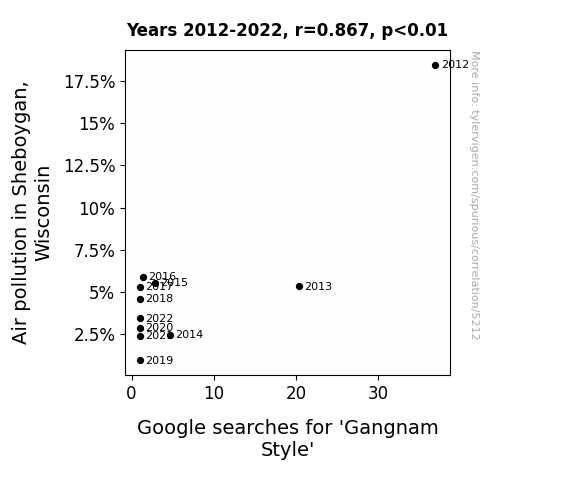 This means 75.1% of the change in the one variable (i.e., Google searches for 'Gangnam Style') is predictable based on the change in the other (i.e., Air pollution in Sheboygan, Wisconsin) over the 11 years from 2012 through 2022.