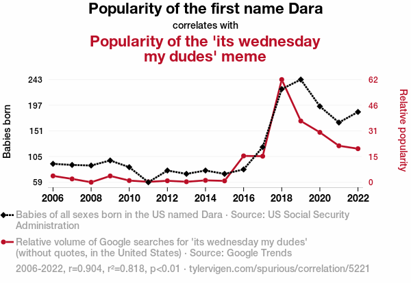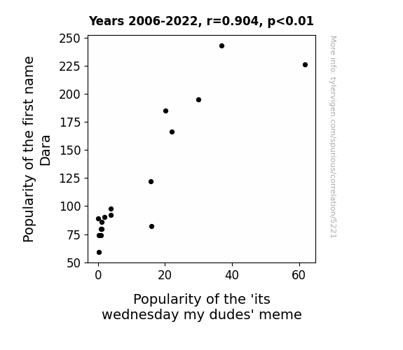 Dara popularity, Wednesday my dudes meme, Dara name correlation, US Social Security Administration data, Google Trends analysis, meme trends, internet phenomena, nomenclature influence, statistical analysis, name frequency, correlation coefficient, midweek meme.