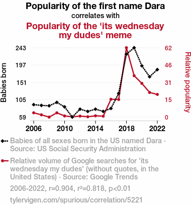 This means 81.8% of the change in the one variable (i.e., Popularity of the 'its wednesday my dudes' meme) is predictable based on the change in the other (i.e., Popularity of the first name Dara) over the 17 years from 2006 through 2022.