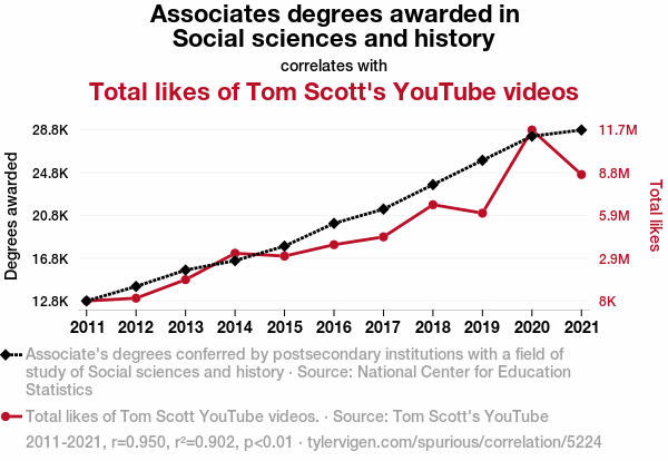 This means 90.2% of the change in the one variable (i.e., Total likes of Tom Scott's YouTube videos) is predictable based on the change in the other (i.e., Associates degrees awarded in Social sciences and history) over the 11 years from 2011 through 2021.