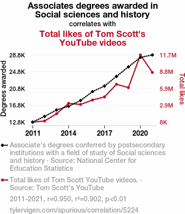 - The spurious research paper: Associating Associates: Exploring the Correlation Between Social Sciences and History Degrees Awarded and Total Likes of Tom Scott YouTube Videos