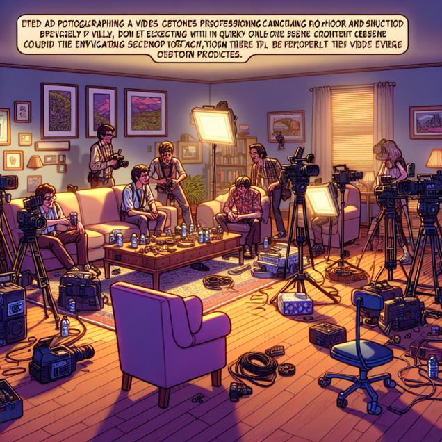 Prompt: An image that looks like it is a scene from a Pixar movie of a dimly lit room in West Virginia. The room is filled with camera equipment and a group of photographers are seen packing up their gear. As they depart, the YouTube video titles of MrBeast lose their colorful, nerdy glow and now appear dull and uninspired. The absence of professional lighting and epic camera angles leaves a void in the geeky allure MrBeast's fans have come to love. The depiction should include only scenes, people, and objects, it should not include text or speech bubbles.