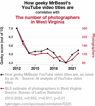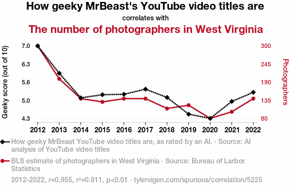 This means 91.1% of the change in the one variable (i.e., The number of photographers in West Virginia) is predictable based on the change in the other (i.e., How geeky MrBeast's YouTube video titles are) over the 11 years from 2012 through 2022.