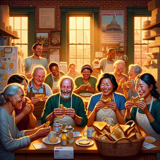 User prompt: Please respond with an image generation prompt that would be likely to create an interesting visual using DALLE-3, using the following style: [ Concept art ] and depicting this scene: In a bustling kitchen in Massachusetts, people are seen enjoying grilled cheese sandwiches, their faces lighting up with contentment and nostalgia. As they savor each bite, the atmosphere becomes filled with a sense of unity and harmony. Meanwhile, in the background, ballots with checkmarks for the Democrat Presidential candidate pile up, symbolizing a landslide victory. The sight of American cheese consumption and political triumph creates a whimsical and unexpected connection, demonstrating the unseen power of comfort and familiarity. Keep the visual depiction simple. Do not include any words or speech bubbles.