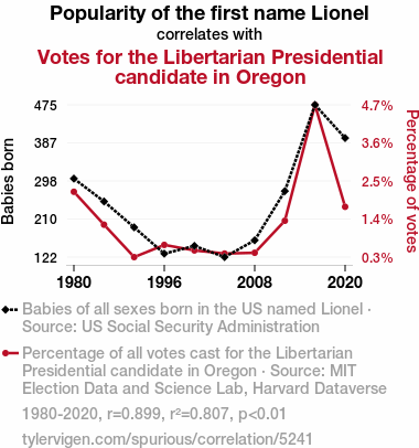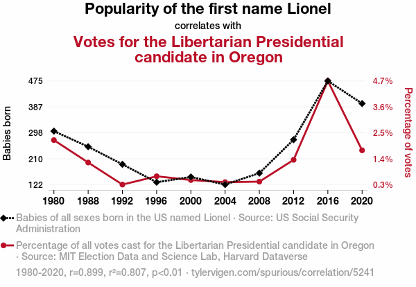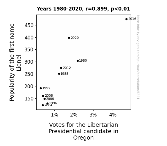User prompt: Please provide potential search keywords for a paper titled Lionel and Libertarians: A Name-Candidate Connection with an abstract of In this study, we explore the curious correlation between the popularity of the first name Lionel and the votes for Libertarian presidential candidates in the state of Oregon. By combing through data from the US Social Security Administration and the MIT Election Data and Science Lab, Harvard Dataverse, we uncovered a rather astonishing correlation coefficient of 0.8985547 with a statistically significant p-value of <0.01 for the years 1980 to 2020. Our findings not only shed light on the influence of names on political preferences but also provide striking evidence of the quirky connections that can exist in the world of elections. So, next time you meet someone named Lionel, you might want to ask them about their stance on libertarianism!