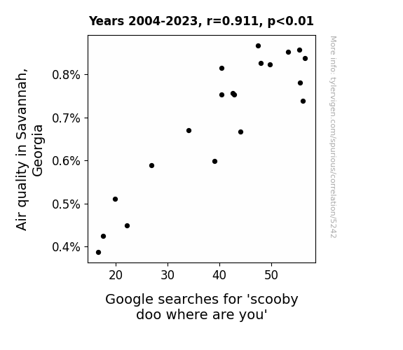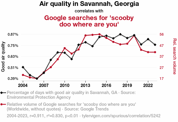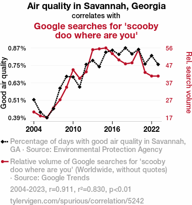 - The spurious research paper: Scooby Doo, Where's the Air? Investigating the Correlation Between Air Quality in Savannah, Georgia and Google Searches for Everyone's Favorite Mystery-Solving Great Dane